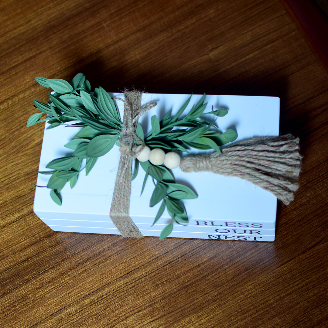 Rustic farmhouse-style book stack tied with jute rope, wooden beads, and green faux leaves.