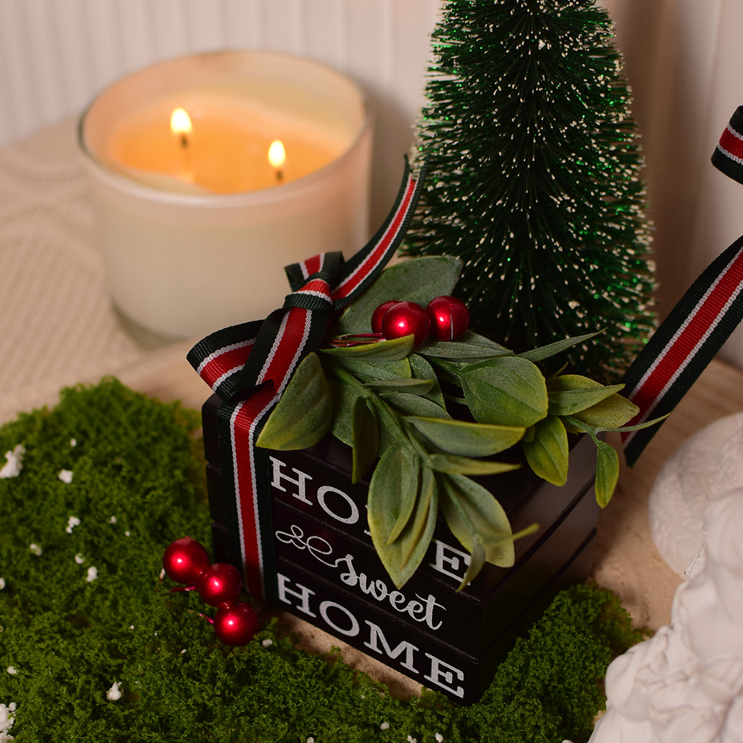 Elegant black mini book stack adorned with festive ribbon, faux greenery, and berries. Adds wa... Elegant black mini book stack adorned with festive ribbon, faux greenery, and berries. Adds warmth and holiday cheer to any tabletop or mantle. Read More Read LessCouldn't load pickup availability