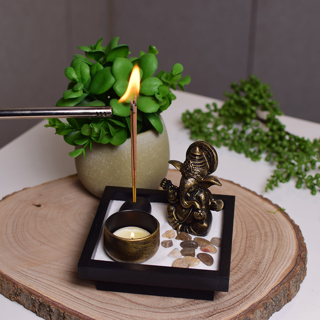Pure zen garden featuring a Ganesha figurine, incense holder, sand base, and decorative stones... Pure zen garden featuring a Ganesha figurine, incense holder, sand base, and decorative stones. A peaceful and elegant decor piece ideal for desks, meditation corners, or gifting. Read More Read LessCouldn't load pickup availability